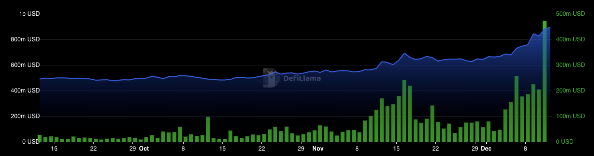 DefiLlama verilerine göre, Avalanche ağının kilitli toplam değeri (TVL), 12 Eylül tarihinden itibaren geçen üç ay içinde yüzde 82 artarak 490 milyon dolardan 894 milyon dolara ulaştı. Aynı dönemde AVAX token işlem hacmi ise yüzde 2.436 artış gösterdi.
